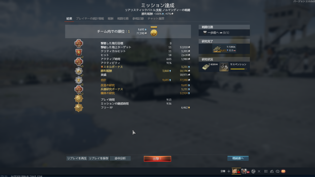 7:12 T-80BVM 3BM60 16式機動戦闘車(FPS) 20 ミッションポイント 1940 + (PA)970 = 2910 SL 71 + (PA)71 = 142 RP