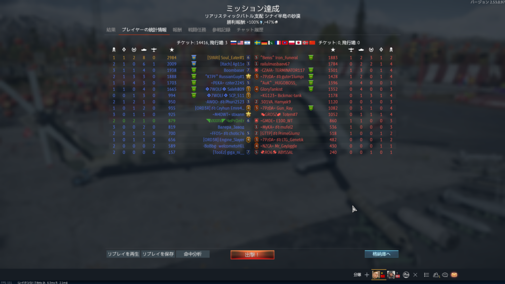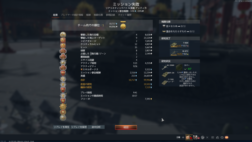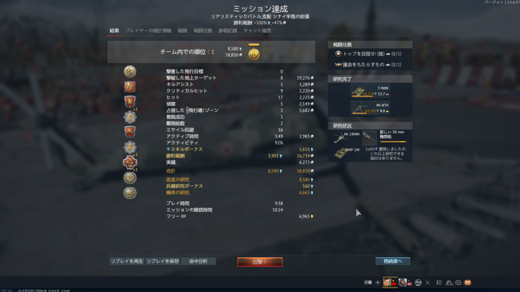 7:34 BMP-2M VOG-30 スカイセイバー(TEL) (AI) 200 ミッションポイント 1730 + (PA)865 = 2595 SL 153 + (PA)153 + (ブースター)23 = 329 RP