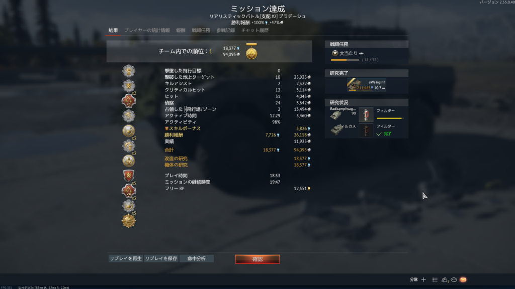 15:58 Radkampfwagen 90 100% 300 ミッションポイント 4498 + (PA)2249 = 6747 SL 356 + (PA)356 + (ブースター)54 = 766 RP